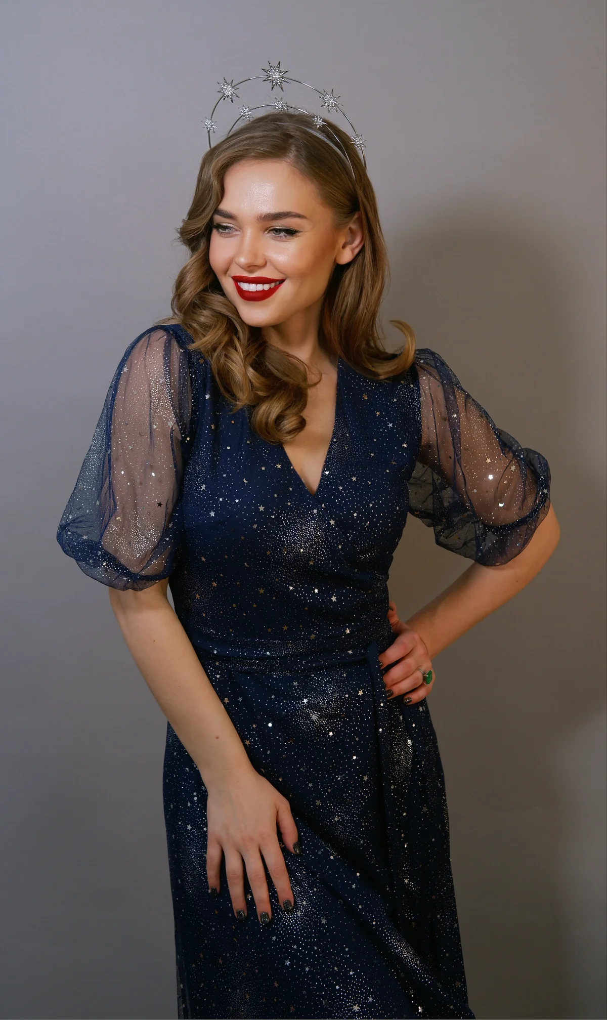 De Winona Dress is een mooie, blauwe wikkeljurk met sterrenprint.
