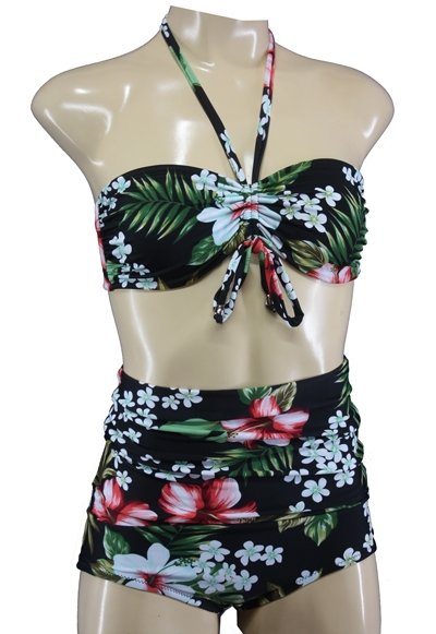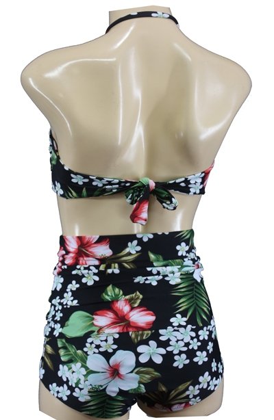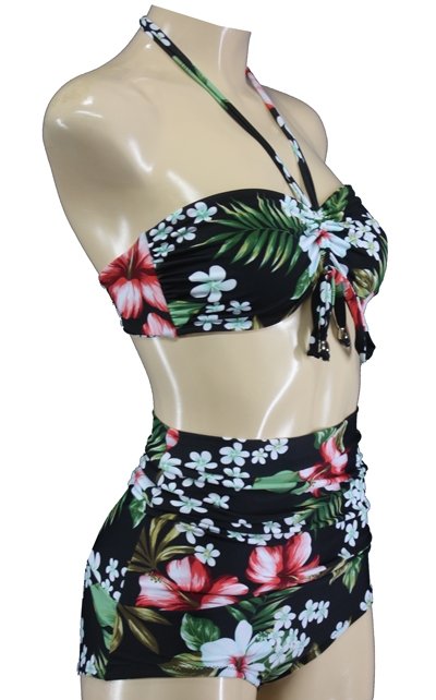Leuke zwarte bikini met tropische bloemen in fifties stijl.