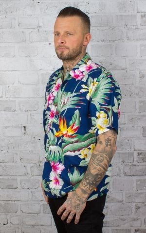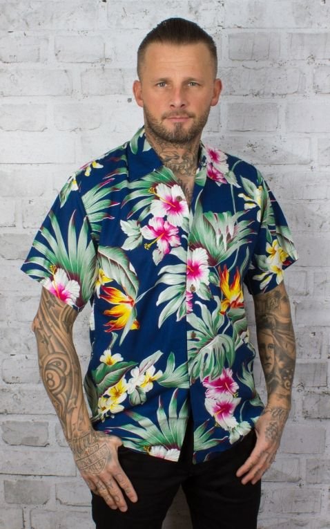 Mooi Hawaii shirt in blauw met hibiscus bloemen en palmen.