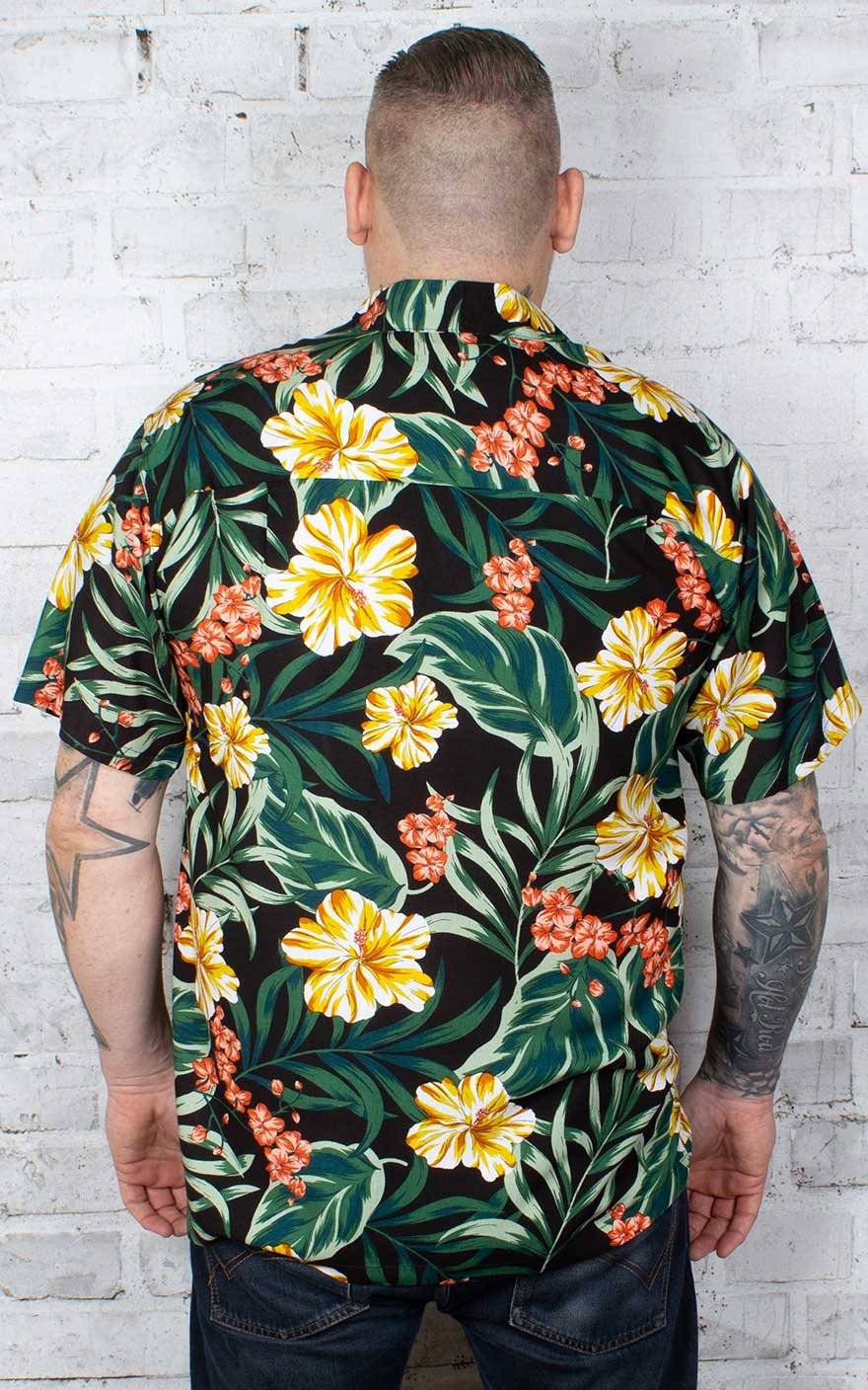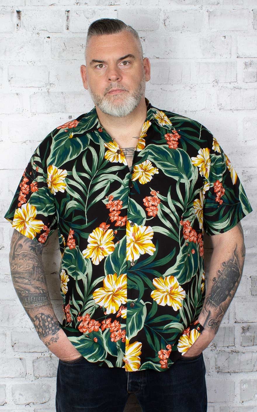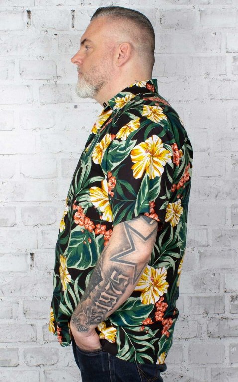 Mooi Hawaii shirt in zwart met gele hibiscus bloemen.