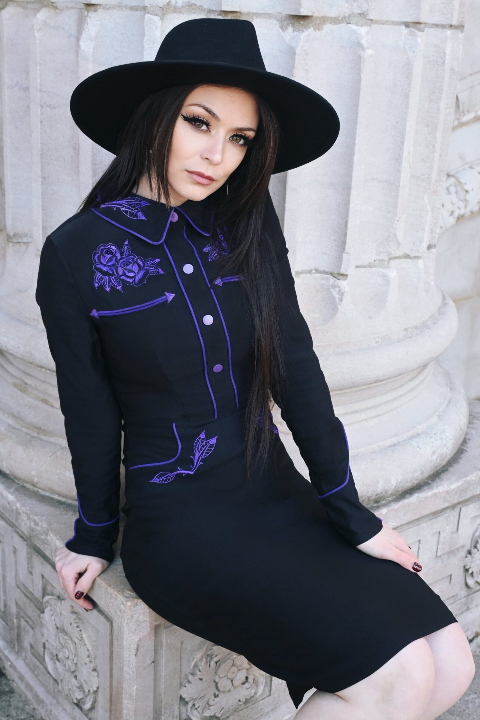 De jurk is gedecoreerd met piping, geborduurde rozen en decoratieve drukknopen zodat de voorkant naadloos blijft.