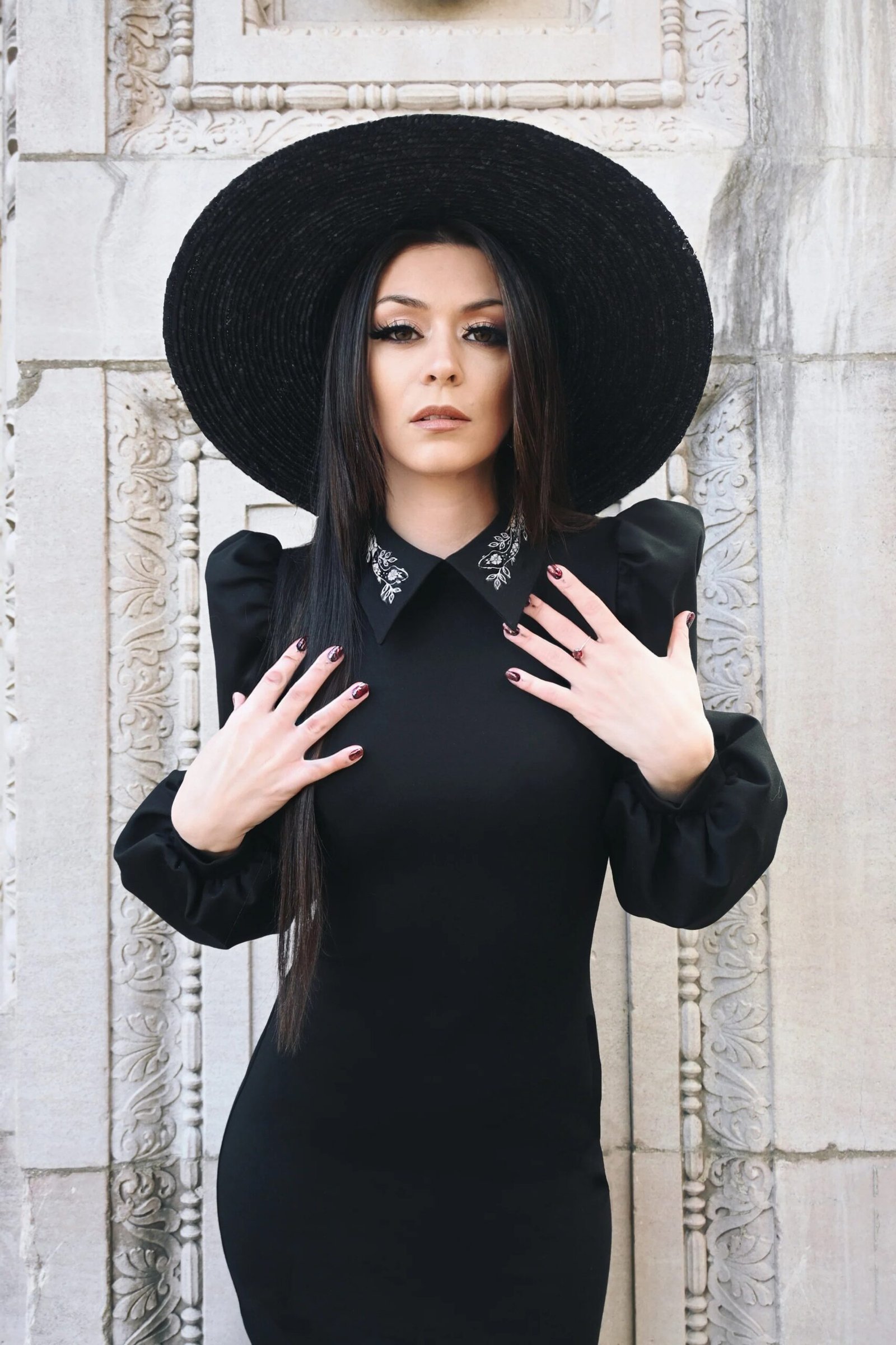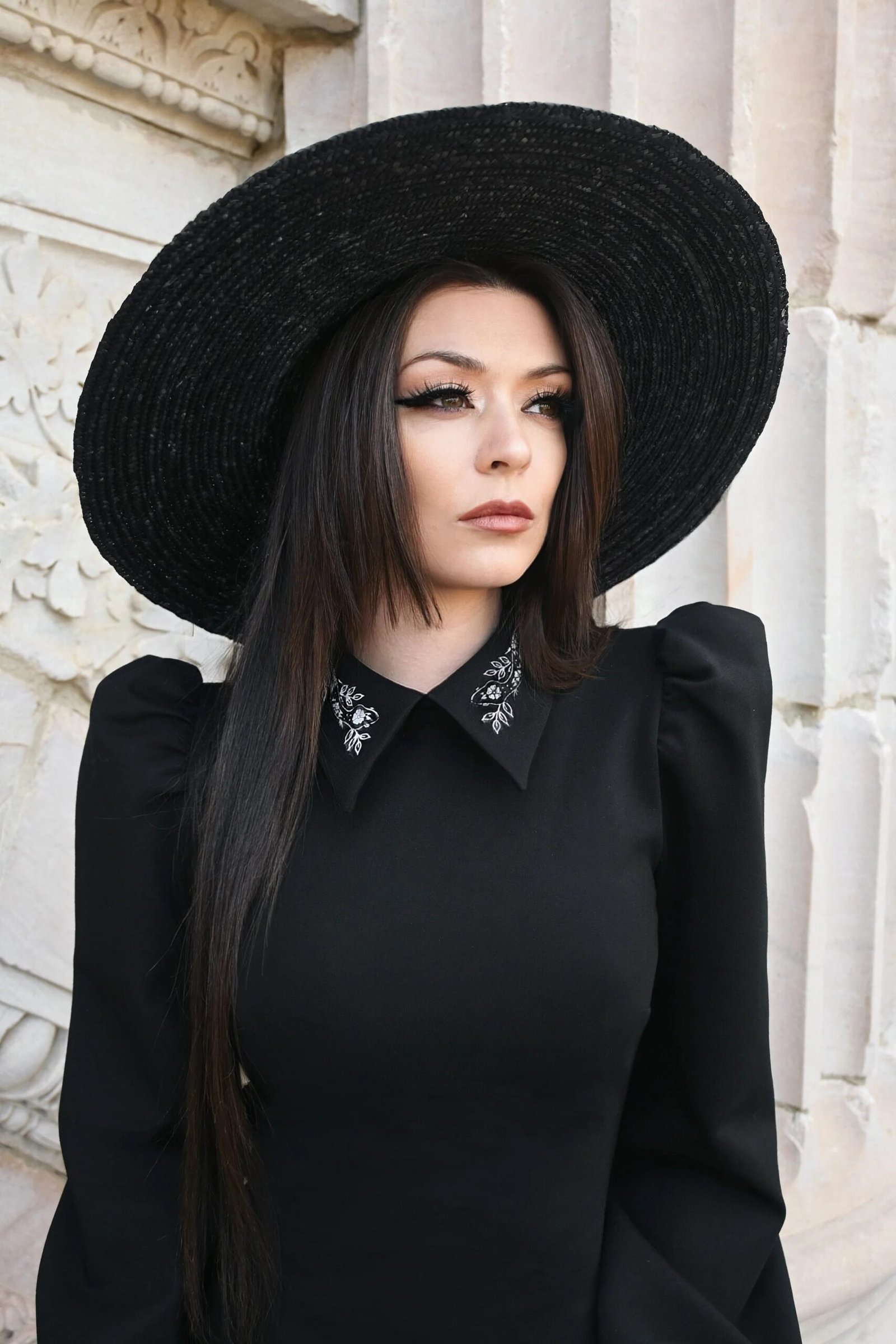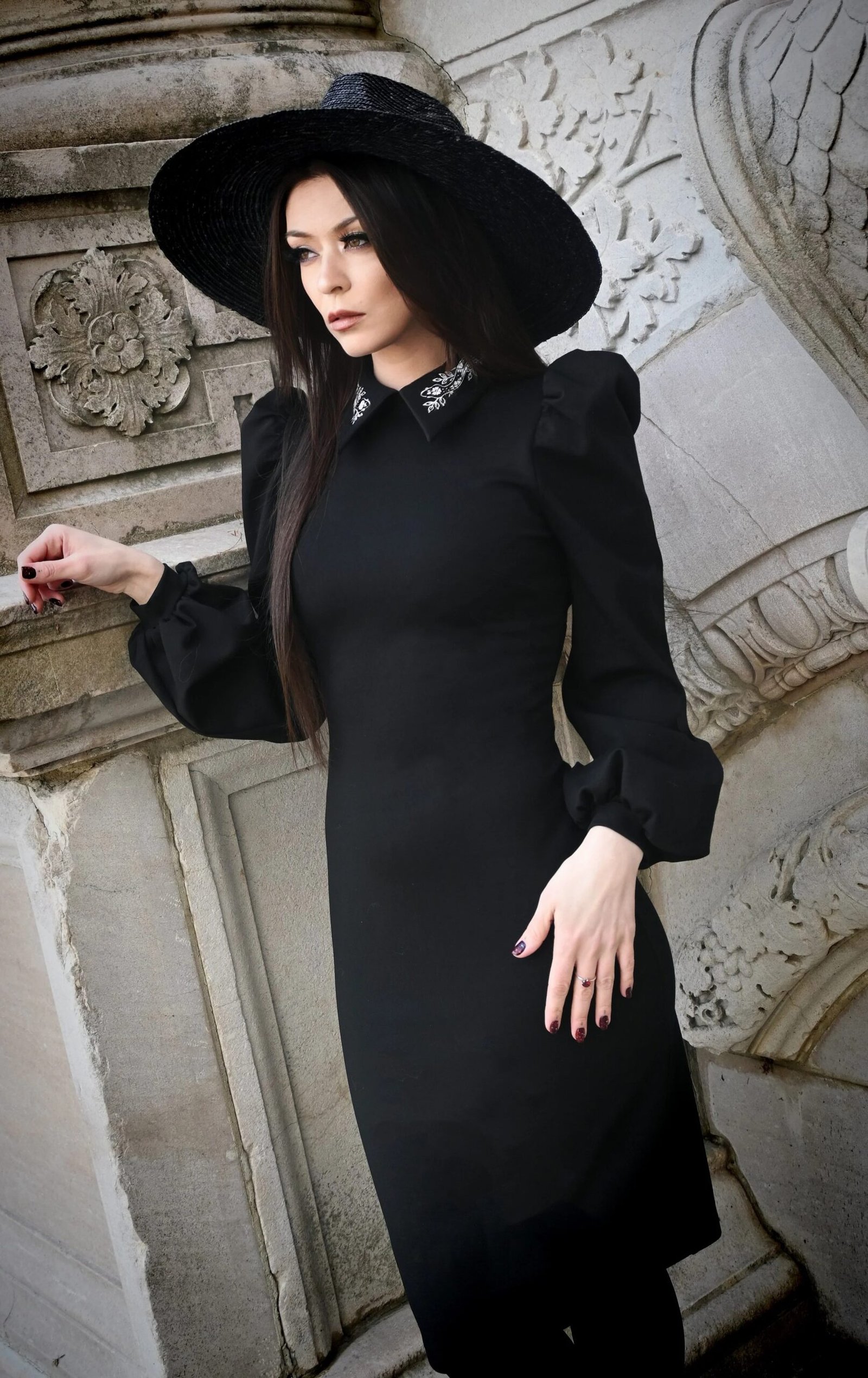 De jurk heeft een puntige kraag met geprinte slangen en bloemen, mooie pofmouwen en lange bishop mouwen met een kleine manchette.