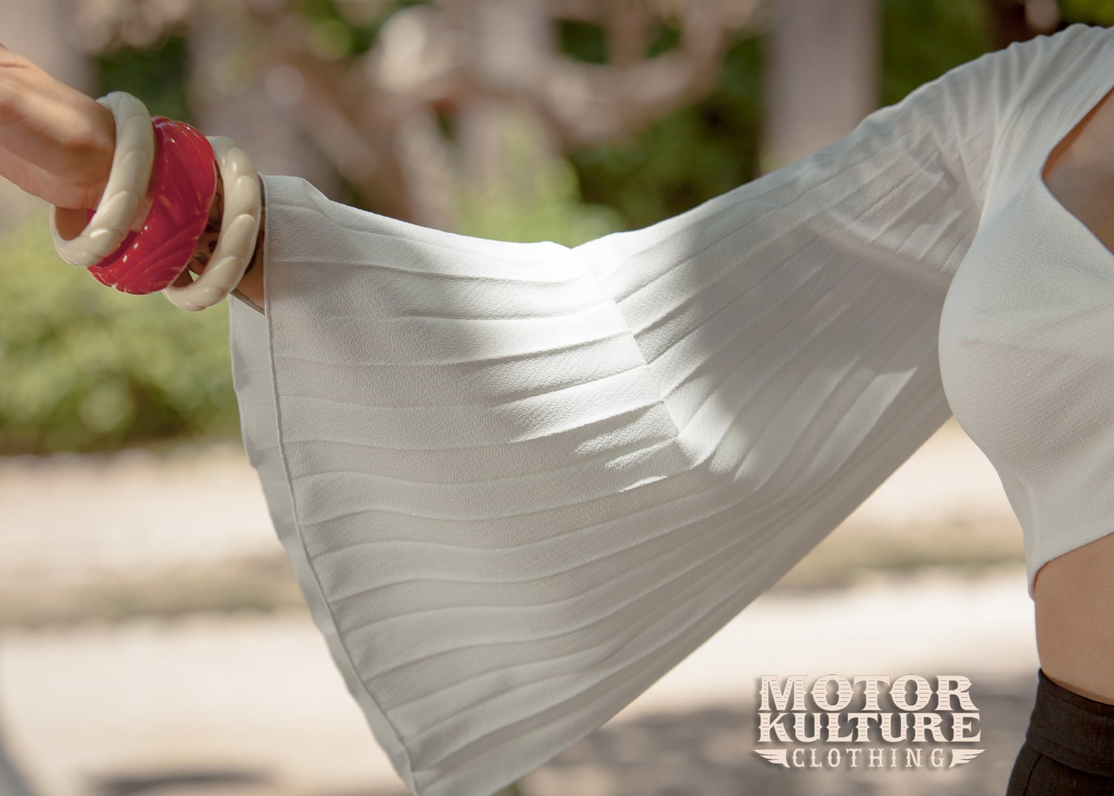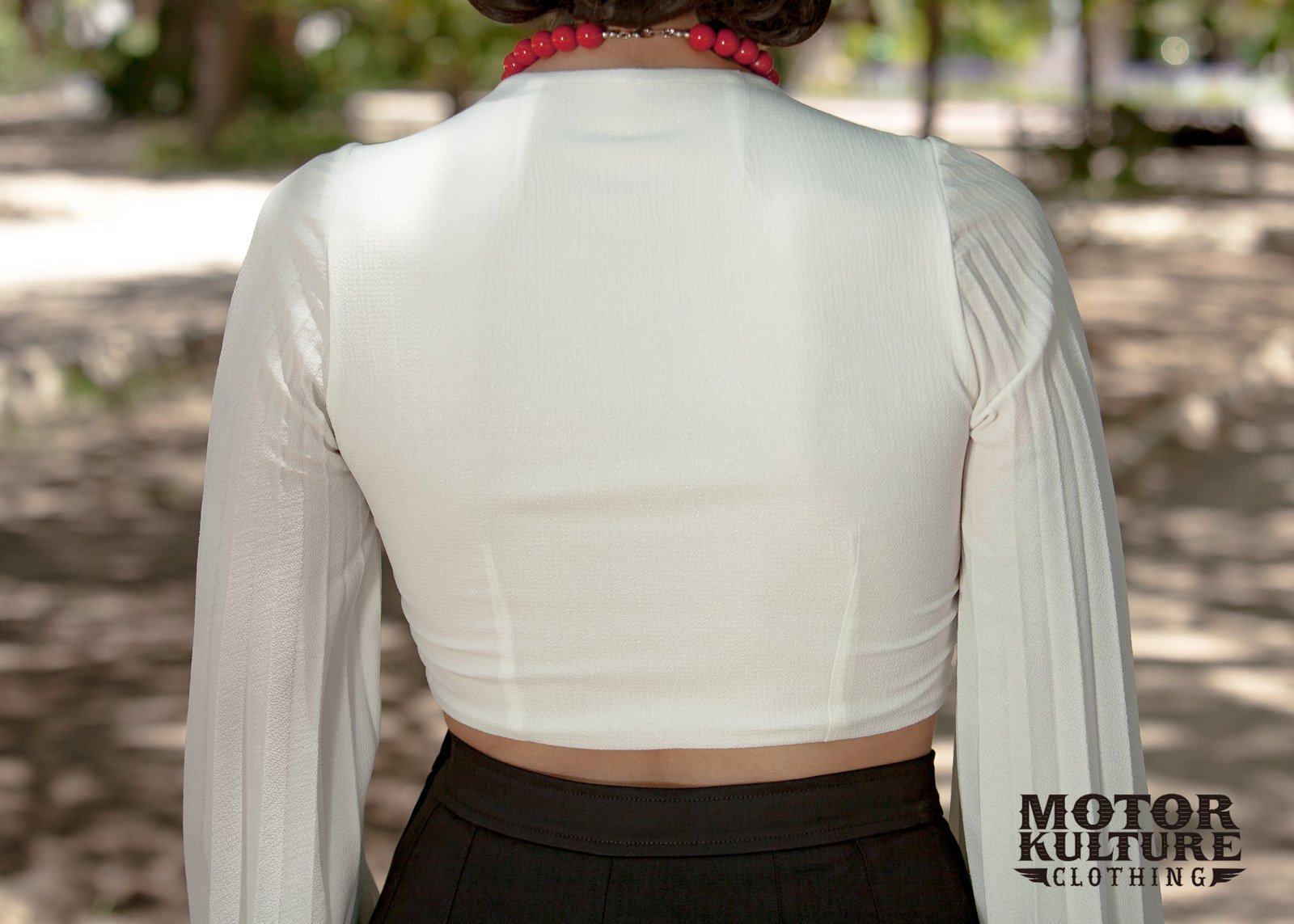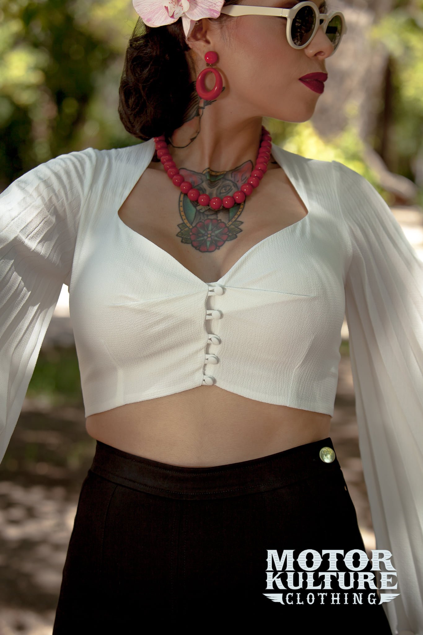 De Hedy Lamarr top is een mooi aansluitende, cropped top met een sweetheart neklijn en mouwen als zonnestralen.