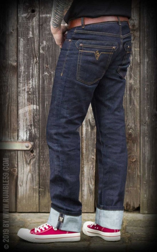 Cool and casual 14 oz jeans made of blue RAW denim.
