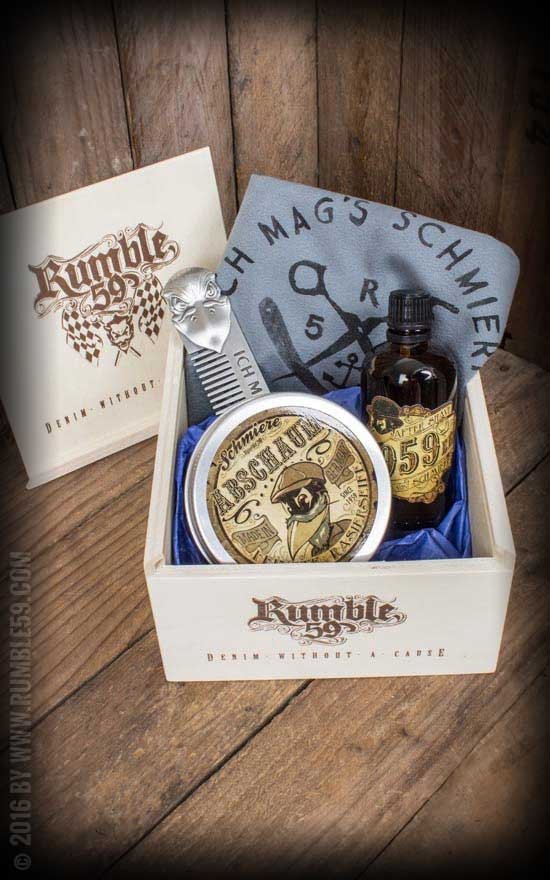 “Schmiere gift set – Shave” is a selection of finest Rumble59 Schmiere products: get a smooth and stubble-free skin with shaving soap, refresh clean-shaven parts of your face with aftershave and style your hair with a cool 3D comb. Last but not least, clean your hands and comb with the microfibre cloth which is literally asking for it: I like it greasy! (“Ich mag’s schmierig”).